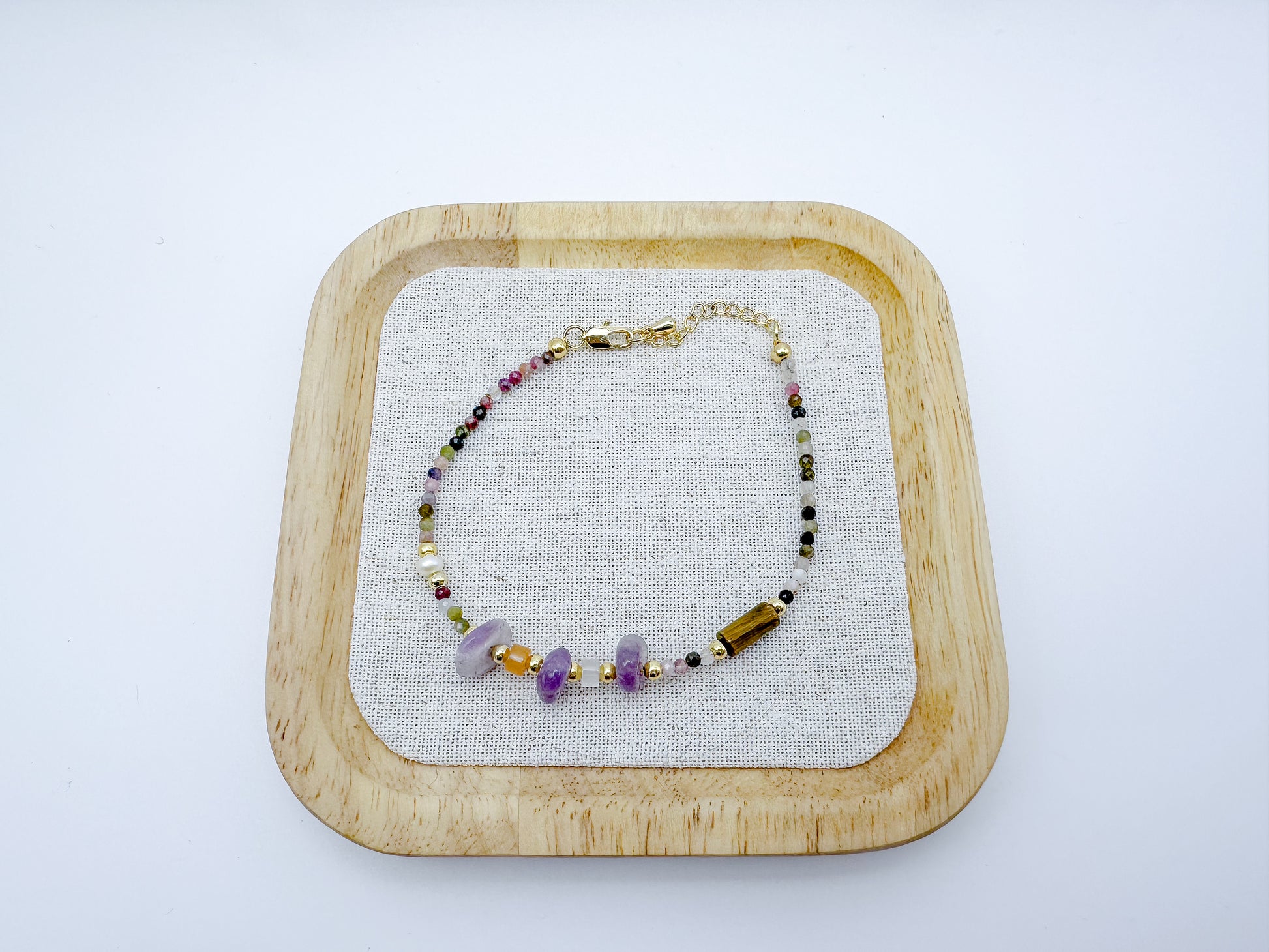 Artfully designed with a captivating blend of textures and tones, this exquisite bracelet showcases multicolor agate, natural stones, and luminous freshwater pearls. Each element is thoughtfully arranged to create a harmonious, nature-inspired aesthetic. Accented with copper components and finished with luxurious 18K gold plating, the piece combines elegance, durability, and a touch of warmth. A beautifully balanced bracelet that embodies natural elegance and timeless sophistication.