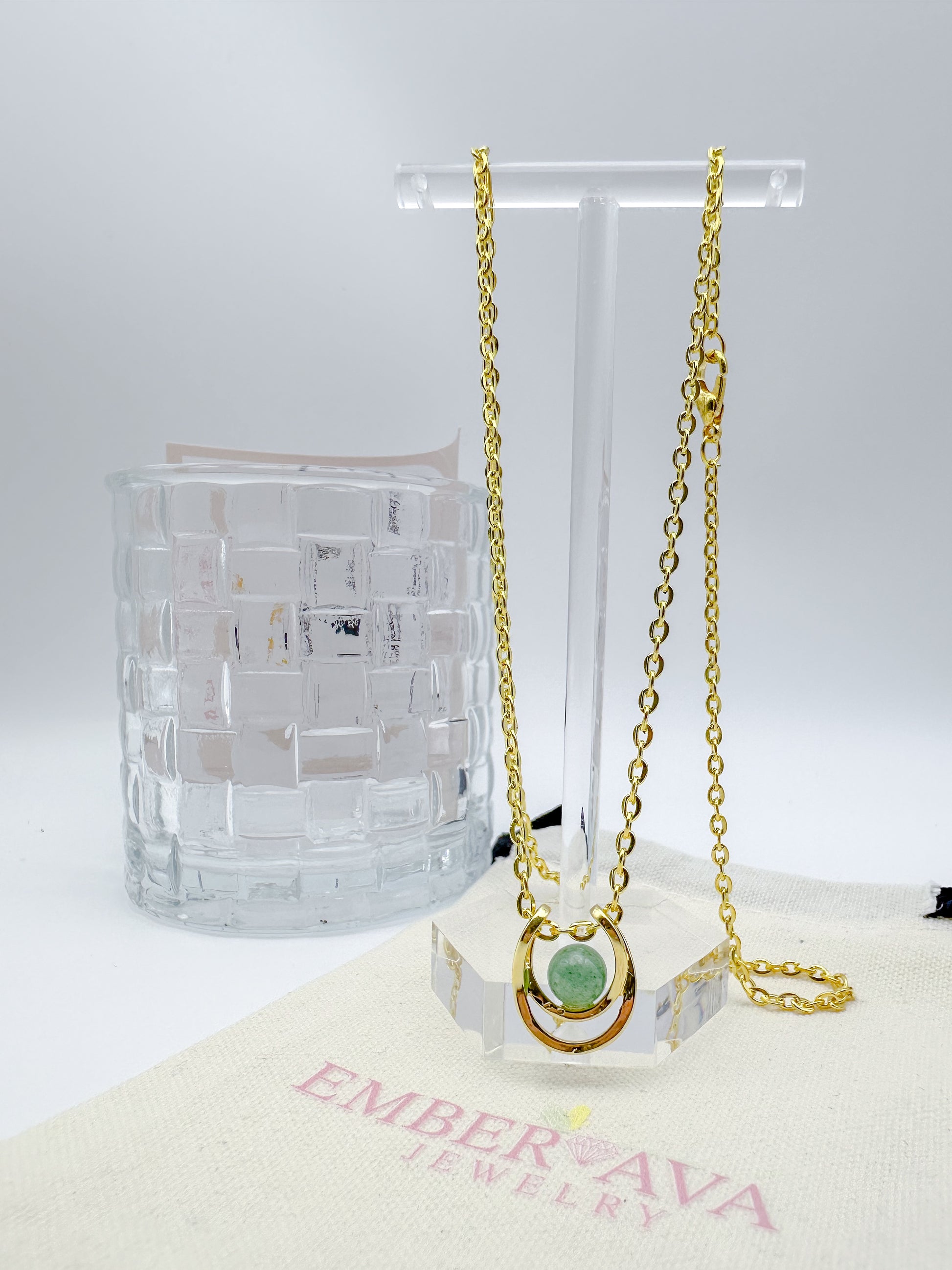 Elevate your style with this stunning gold necklace featuring a mesmerizing green aventurine crystal ball pendant in a sleek U-shape design. This exquisite piece seamlessly blends elegance with contemporary style, making it a must-have accessory for any fashion-forward woman.