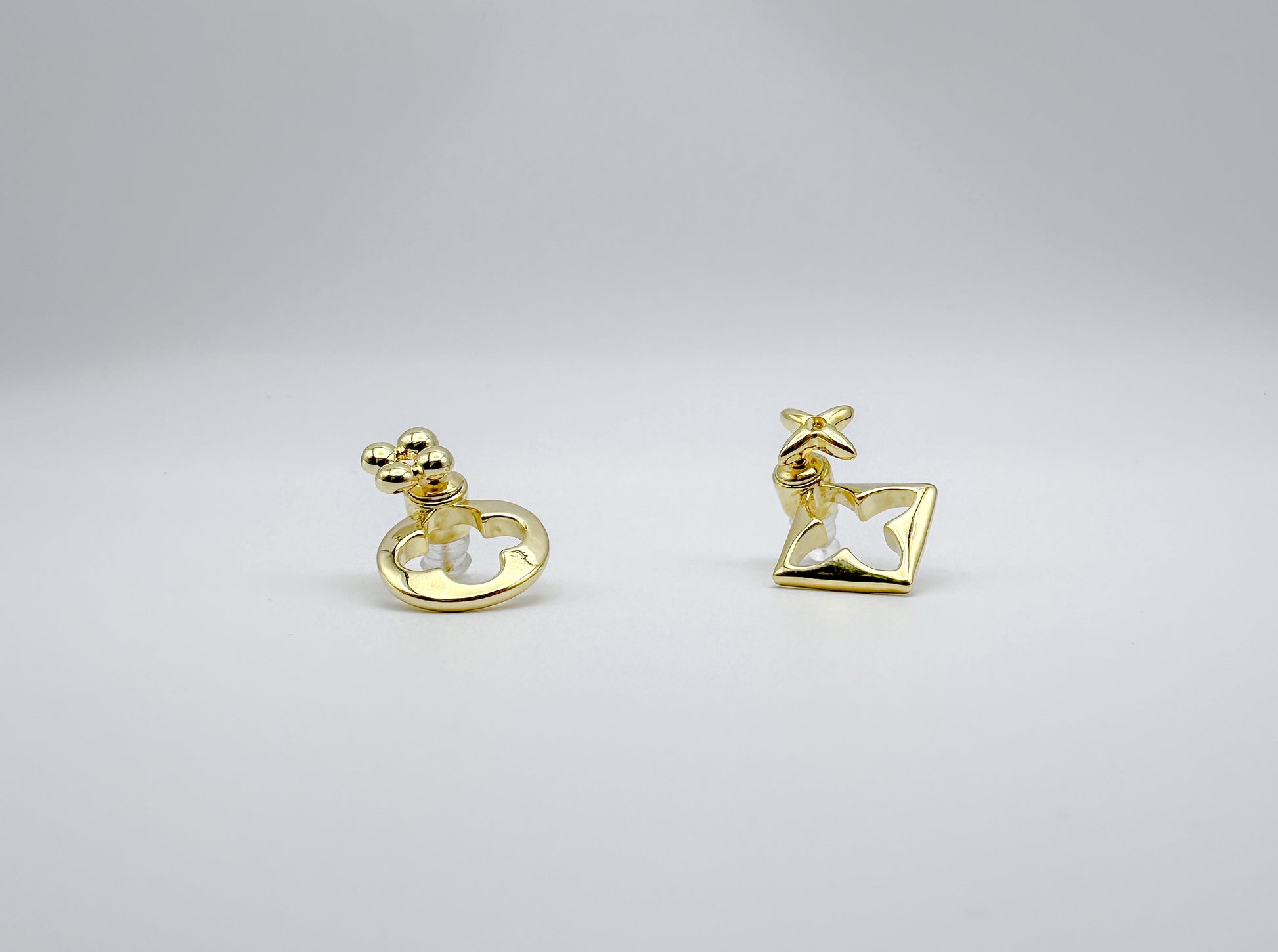 A striking combination of a long, slender drop earring with a hollow geometric pendant, paired with a minimalist stud that complements the design.
