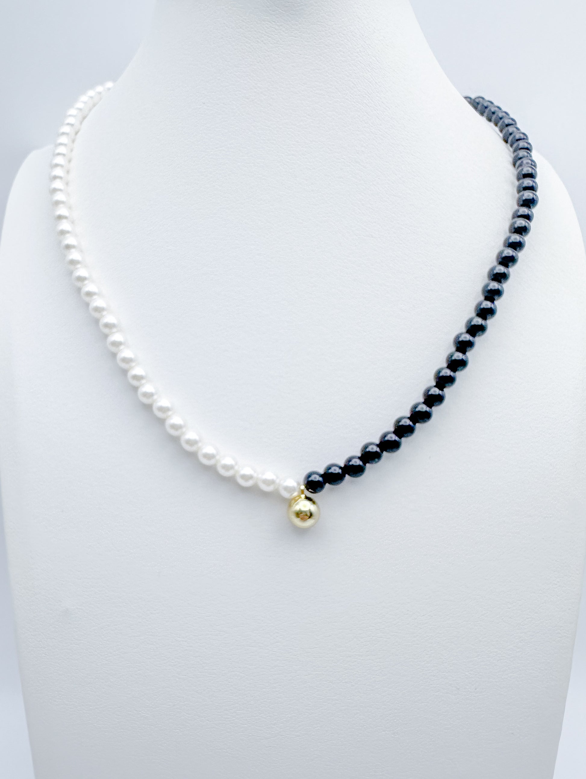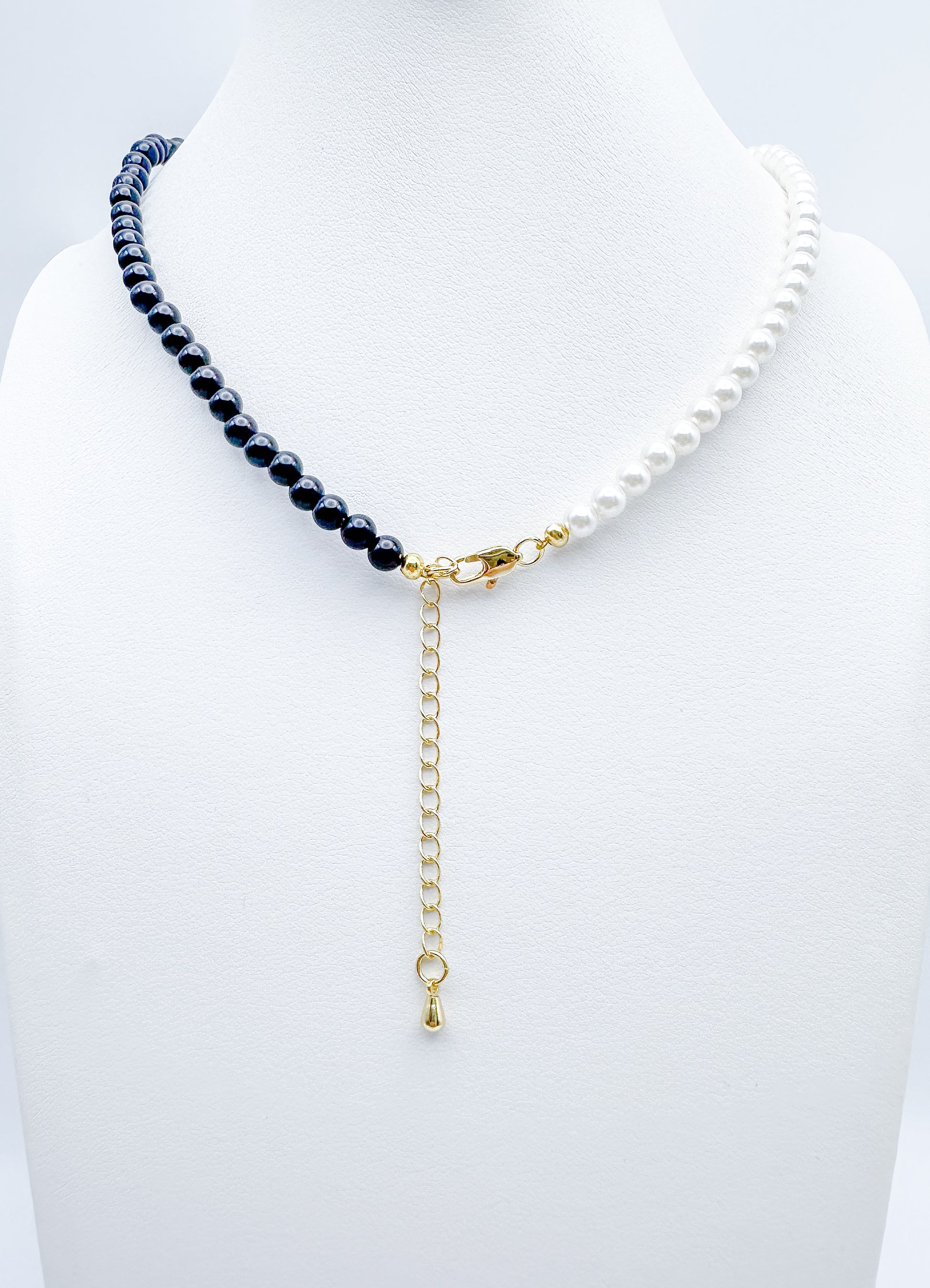 Striking in its simplicity, this elegant choker blends modern minimalism with timeless luxury. Featuring a harmonious arrangement of black and white beads, the design is elevated by radiant crystal pearls that add a soft, luminous touch. Finished with 18K gold plating, this piece exudes understated sophistication—ideal for accentuating the collarbone with grace and poise.